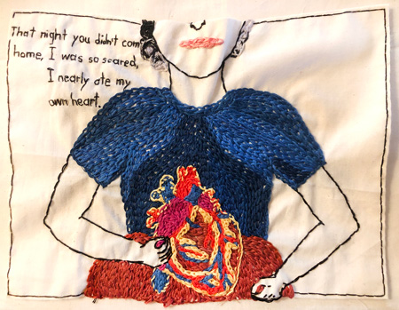 I have a strong internal sense of what I consider interesting or important. My embroideries are an analog blog, a way of trying to assuage human reliance on digital communications with a need to live in the body through immersion in hands-on craft. While I recognize that I am not alone in this interest, I like to think that my voice as a writer, which comes through in my work literally as text and visually as narrative illustrations, distinguishes me from trends, such as re-creating text messages and tweets to visually resemble the digital iconography versus crafting a new visual and verbal vocabulary to talk about the interstices of human connection, and the quiet parts of being that are often unspoken or unarticulatable.